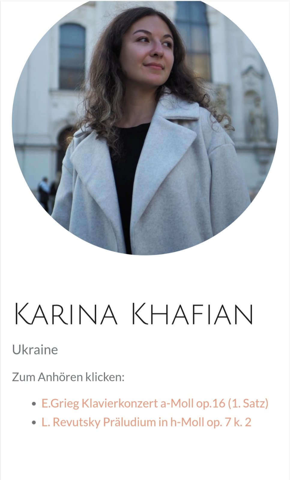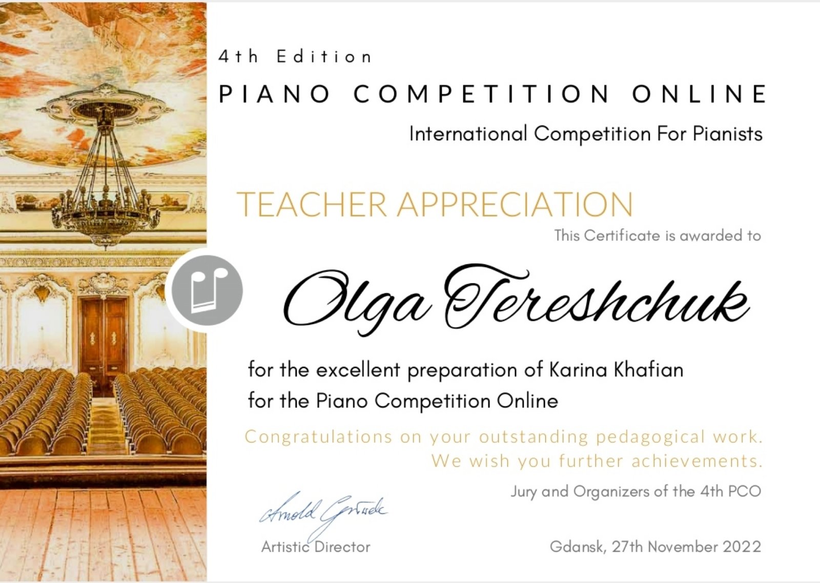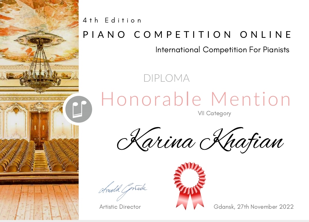 Вітаємо Хафіан Каріну, студентку 4-го курсу відділу фортепіано Уманського обласного музичного фахового коледжу ім. П.Д. Демуцького клас викладача Терещук О.А., з отриманням почесної відзнаки на lV міжнародному конкурсі піаністів.